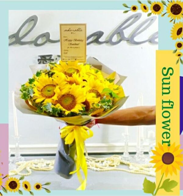 Wrapping bouquet bunga matahari atau sun flower, simbol kepatuhan, kebahagian, kesetian.