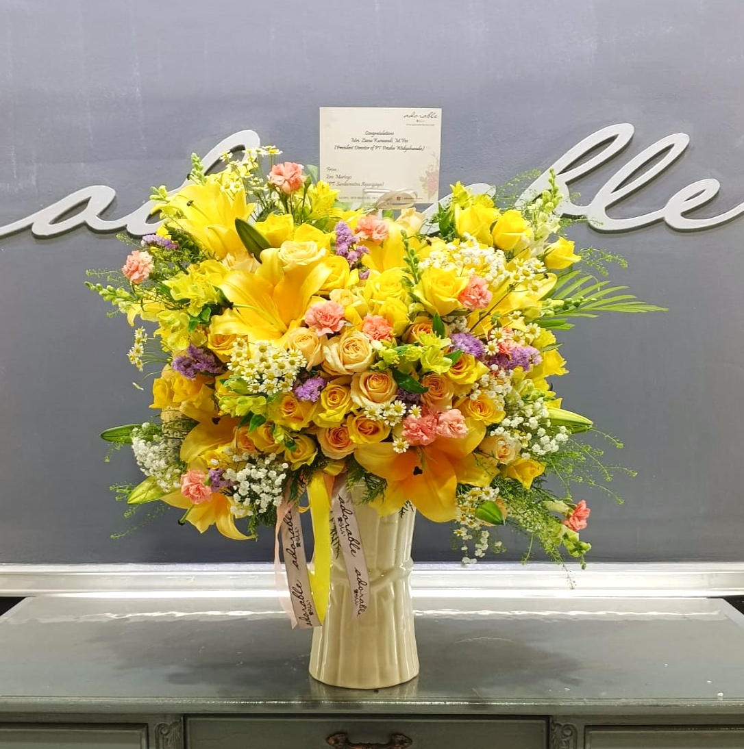 Bring the glow of a summer garden indoors! Our “Sunshine in Bloom” arrangement is a cheerful mix of vibrant yellows and soft pastels. Featuring premium Oriental Lilies and Sweetheart Roses, this bouquet is layered with texture and topped with a touch of purple statice for a pop of contrast. It’s more than a gift—it’s an instant mood-lifter.