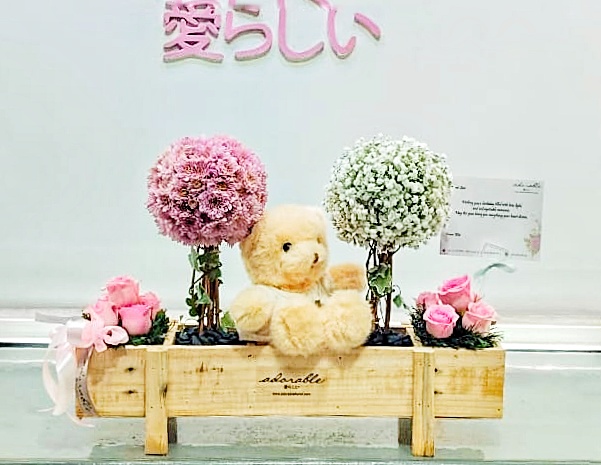 “A little garden of love in a wooden crate — soft pink blooms, delicate baby’s breath, and a cuddly bear to bring comfort and smiles. A gentle reminder that even the simplest moments can feel magical. Elegant & Descriptive